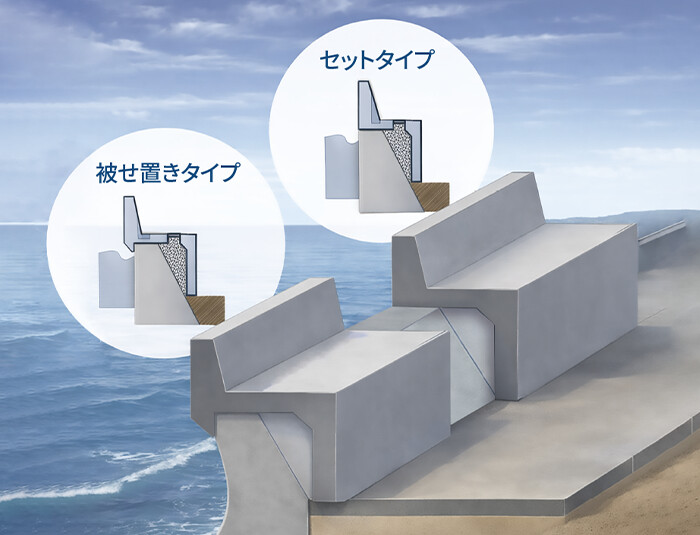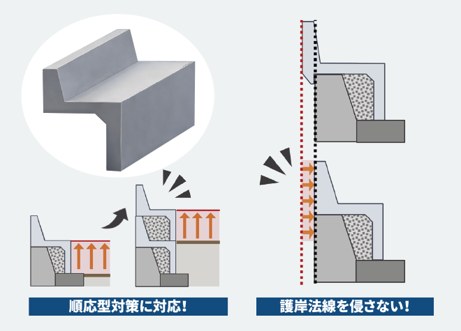 従来、海面上昇や越波対策として行われてきた現場打ちコンクリートによる 簡易的な嵩上げ工事にプレキャスト工法を提案します。